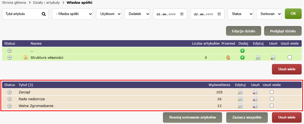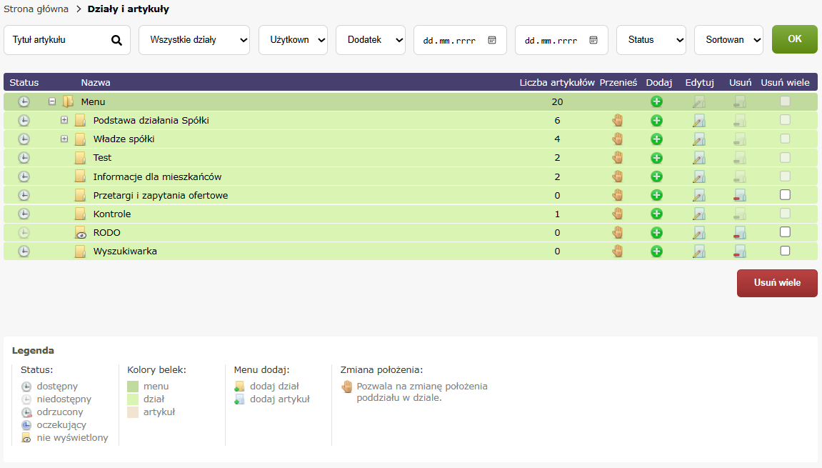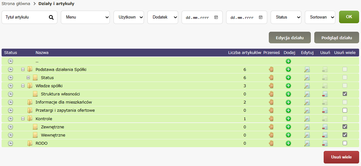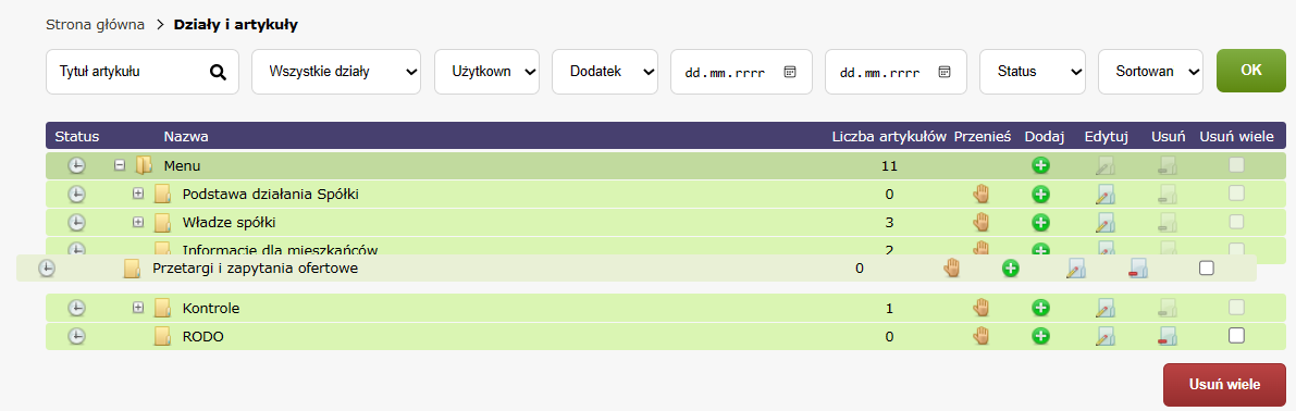 Możesz usunąć wiele działów na raz. Wystarczy zaznaczyć checkboxy przy odpowiednich działach i kliknąć przycisk Usuń wiele. W systemie jest możliwość usuwania działów, które nie zawierają artykułów.