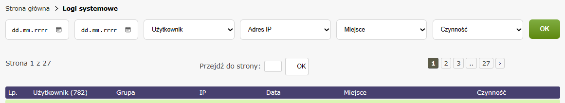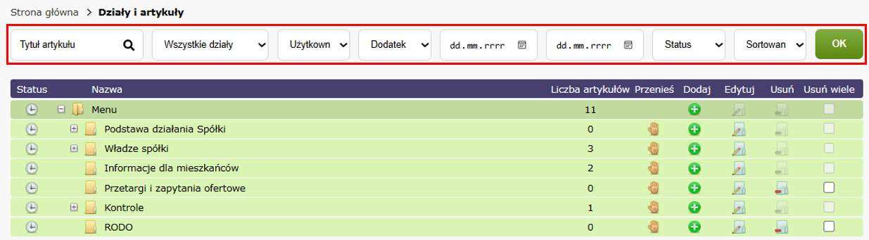 Artykuły możemy wyszukiwać za pomocą wyszukiwarki znajdującej się nad drzewem działów. Możemy skorzystać z pól formularza wyszukiwania aby zawęzić kryteria wyszukiwania. Klikając przycisk OK (bez wypełniania żadnego pola wyszukiwarki) wyświetli się lista wszystkich artykułów według daty dodania (najnowszy na górze).
