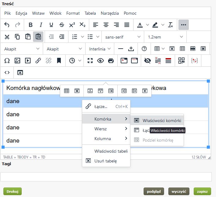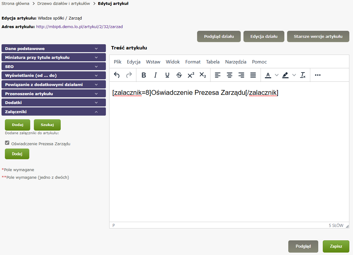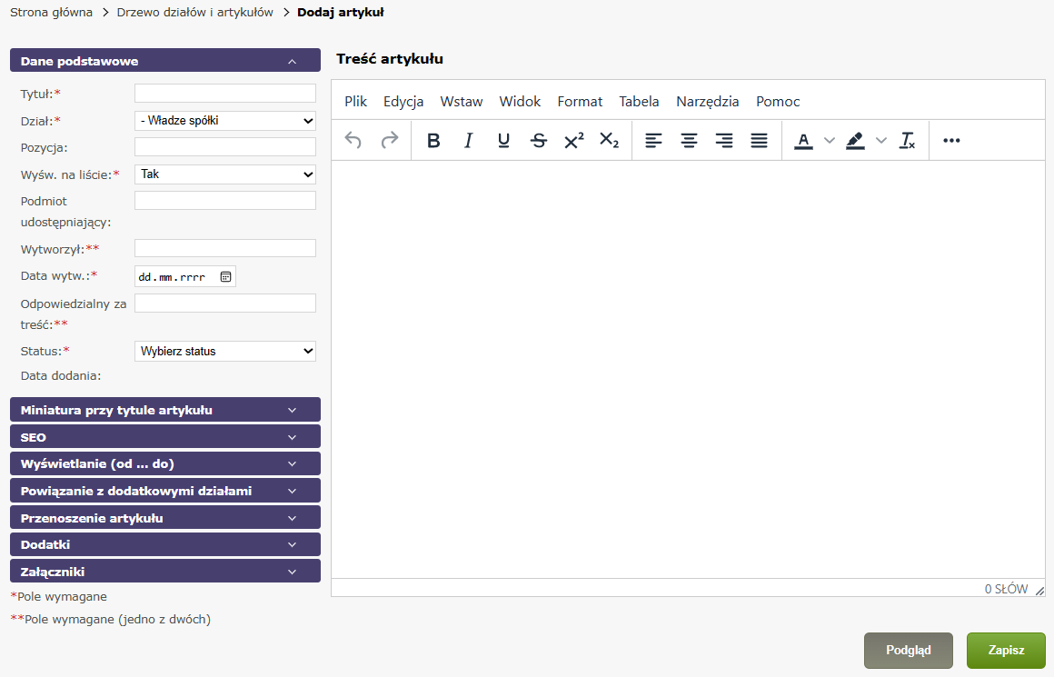 - Klikamy przycisk Podgląd w celu zobaczenia wyglądu artykułu przed zapisaniem go do bazy danych.