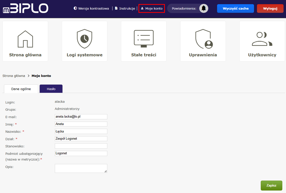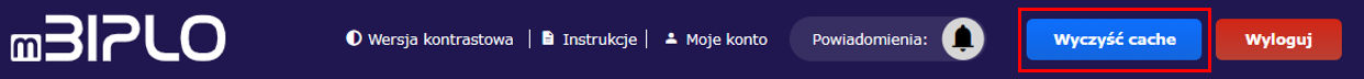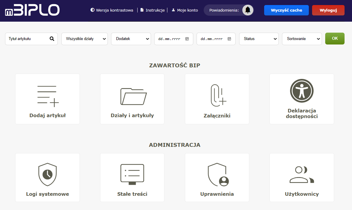 - sekcja nagłówka zawierająca: przełącznik wersji kontrastowej panelu administracyjnego, instrukcję obsługi, link Moje konto, Powiadomienia oraz przyciski: Wyczyść cache oraz Wyloguj,