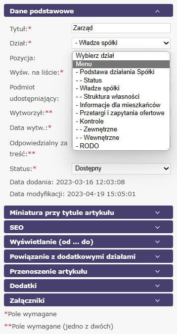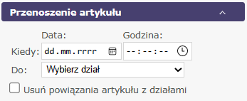 W systemie istnieje możliwość określenia, że dany artykuł ma zostać przeniesiony do wskazanej lokalizacji w drzewie działów.