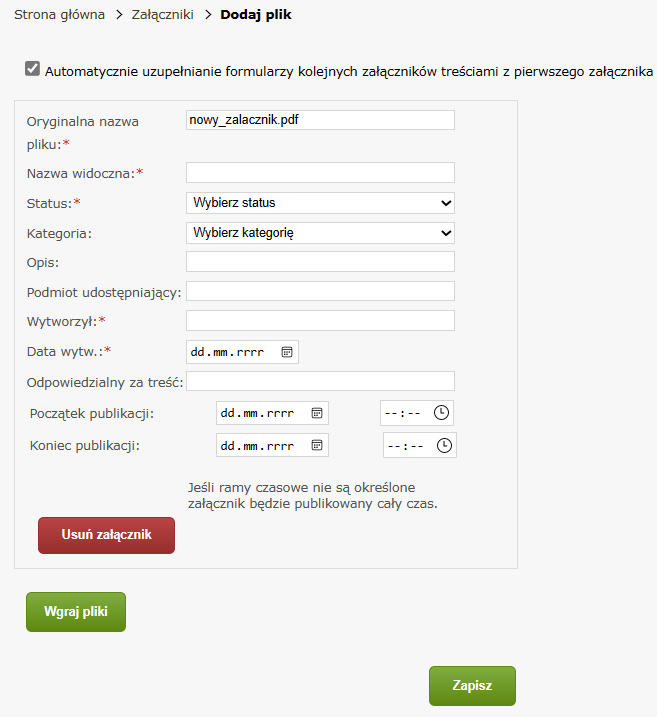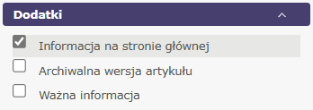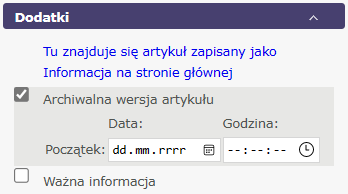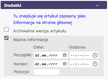 Możemy użyć różnych kombinacji czasu wyświetlania artykułu. Określając tylko początek (datę i godzinę) a pozostawiając pole koniec bez wypełnienia spowodujemy, że artykuł włączy się o określonym czasie i pozostanie widoczny bez ograniczenia czasowego. Jeśli określimy tylko koniec wyświetlania artykułu, zostanie on włączony po kliknięciu przycisku Zapisz (pod artykułem) i będzie widoczny tylko do określonej daty i godziny.