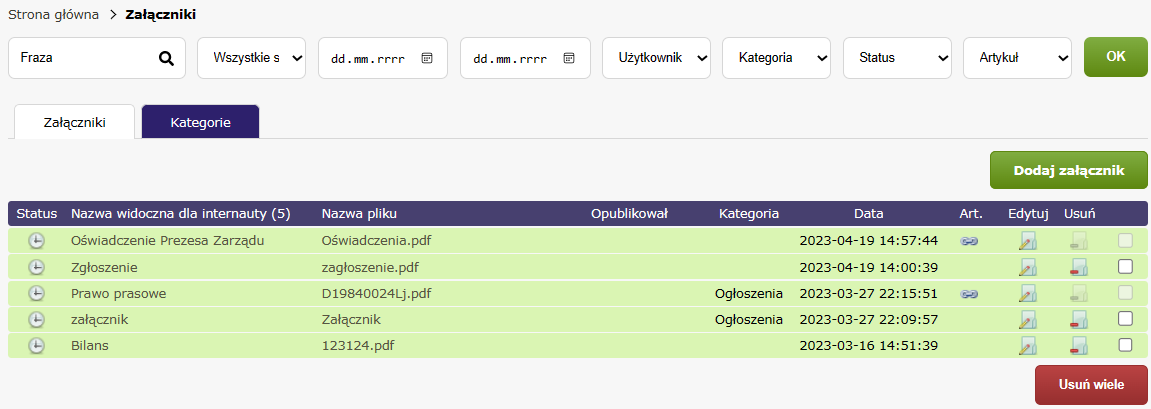 Przy edycji artykułu w zakładce Załączniki odznacz chceckbox przy wybranym załączniku. Następnie zapisz artykuł. Plik zostanie usunięty z tego artykułu.