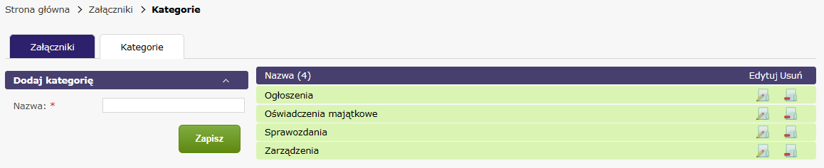 - Rodzaj menu jest oznaczony ciemniejszym kolorem zielonym (w przypadku, gdy na stronie jest dostępnych więcej rodzajów menu np.: poziome, pionowe i w stopce). Do menu głównego możemy dodawać jedynie działy.