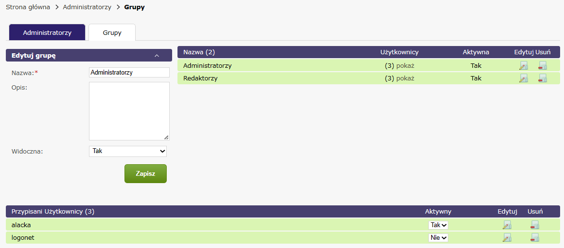 - Administracyjnej - jest dostępna tylko dla uprawnionych pracowników, którzy zarządzają i aktualizują zawartość portalu tzw. redaktorów.