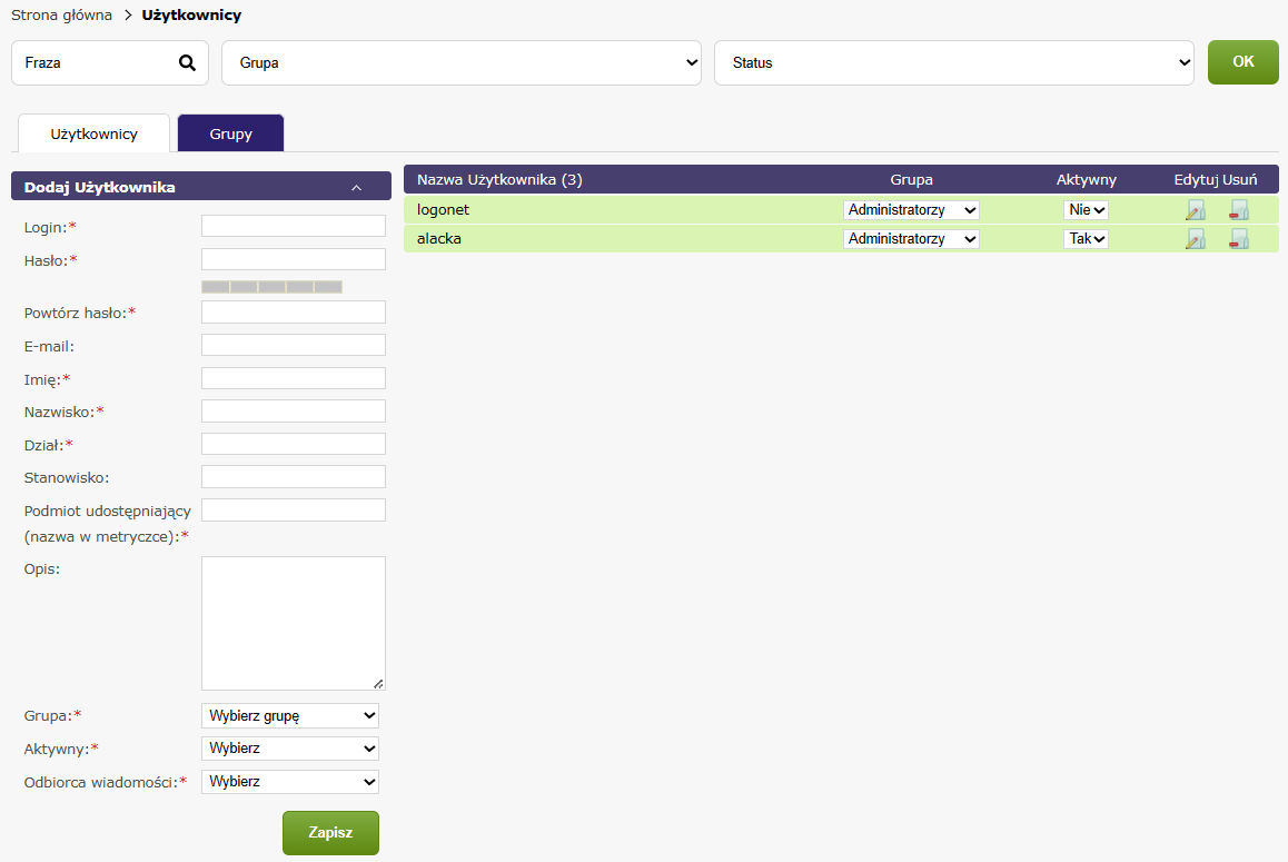 Dostęp do strony administracyjnej mają wyłącznie uprawnione osoby zwane użytkownikami, z których każda posiada indywidualny login i hasło niezbędne do prawidłowego procesu zalogowania się do strony.