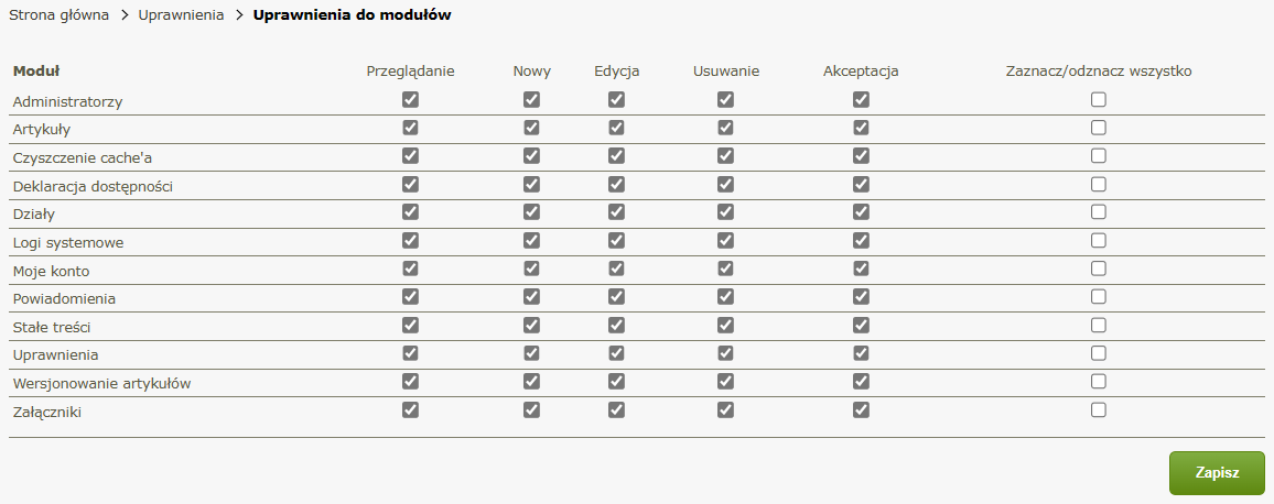 - Checkbox (pozwala na seryjne usuwanie działów).