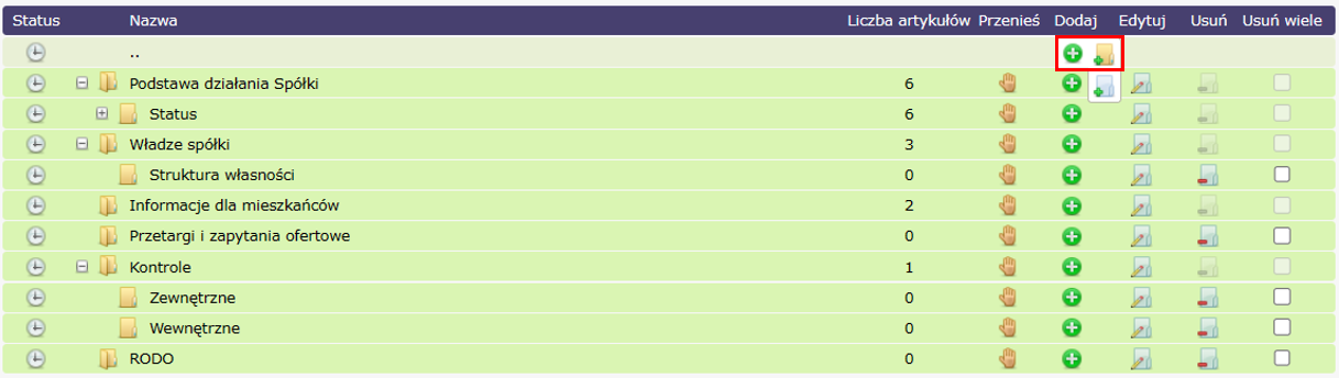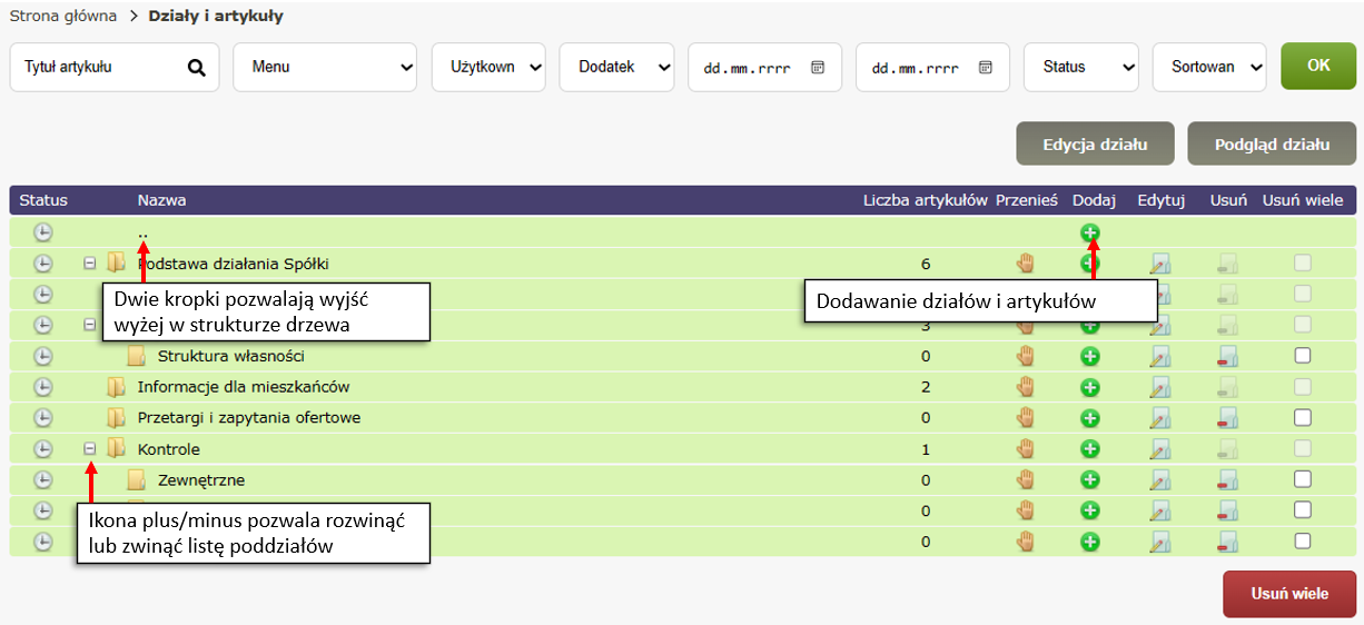 - Dwie kropki na szczycie listy działów pozwalają wyjść poziom wyżej w drzewie, przy dwóch kropkach znajduje się ikona plus, dzięki której można dodawać działy i artykuły w dziale, w którym aktualnie się znajdujemy.