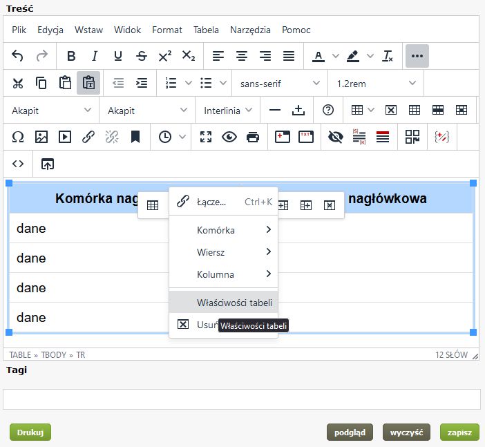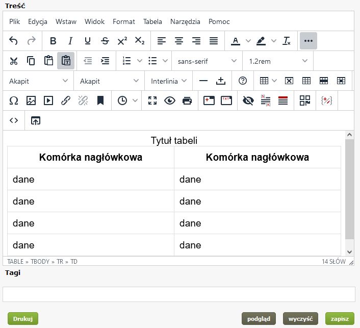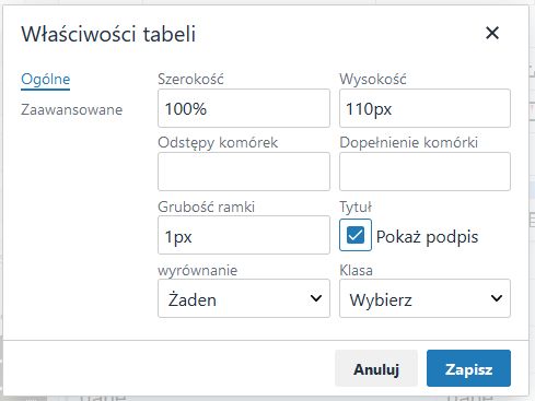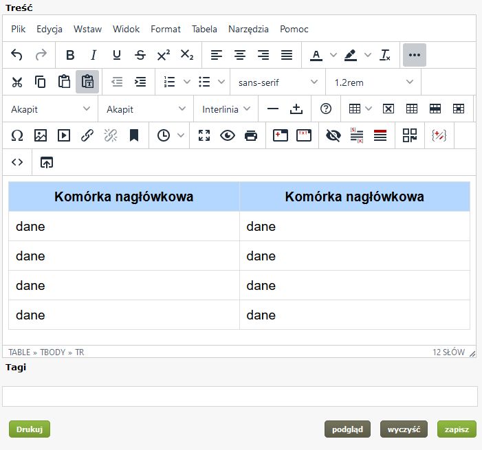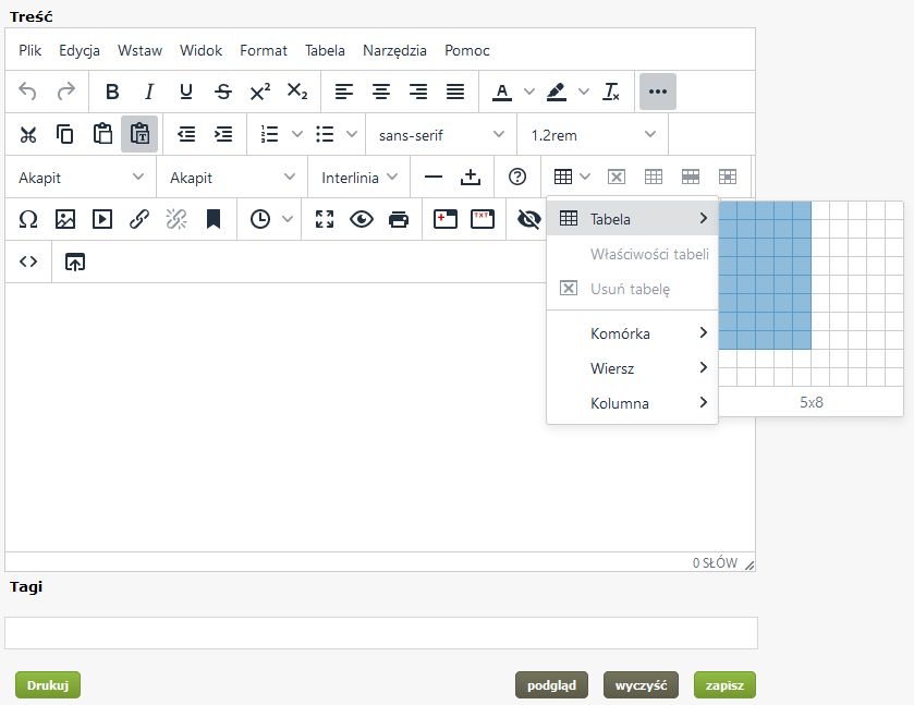 W edytorze można wstawiać tabele. Wygląd tabeli czyli kolor i grubość ramki jest określony przez wykonawcę serwisu odgórnie.