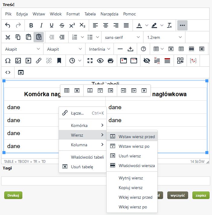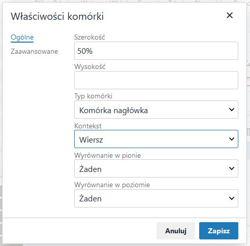 W dodanej tabeli możemy dowolnie dodawać wiersze i kolumny. Aby dodać wiersz lub kolumnę należy: