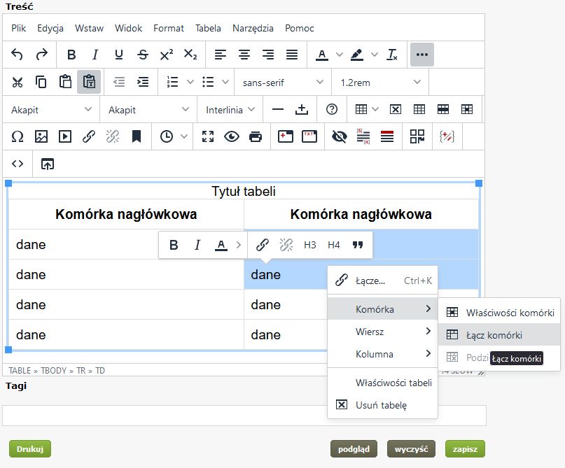 Istnieje możliwość łączenia komórek w celu tworzenia tabel o skomplikowanej strukturze.