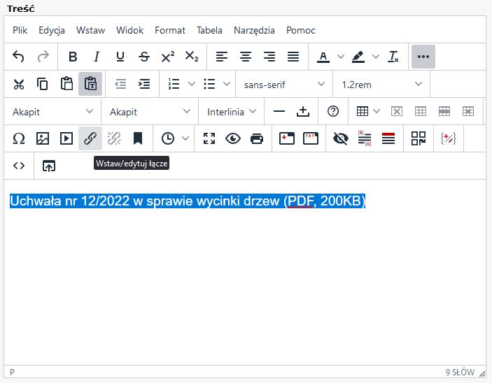 W edytorze możemy wstawić linki do stron, adresów e-mail czy do plików. W przypadku plików zalecamy dodawać je przez moduł Załączniki.