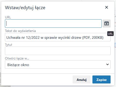 - W wyświetlonym oknie wypełniamy pole URL (adres internetowy) lub wybieramy ikonę znajdującą się po prawej stronie pola URL, która otworzy nam Menadżer plików (jeśli chcemy podpiąć pod link dowolny plik).