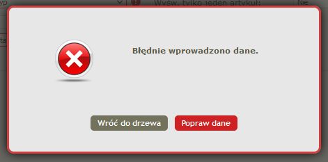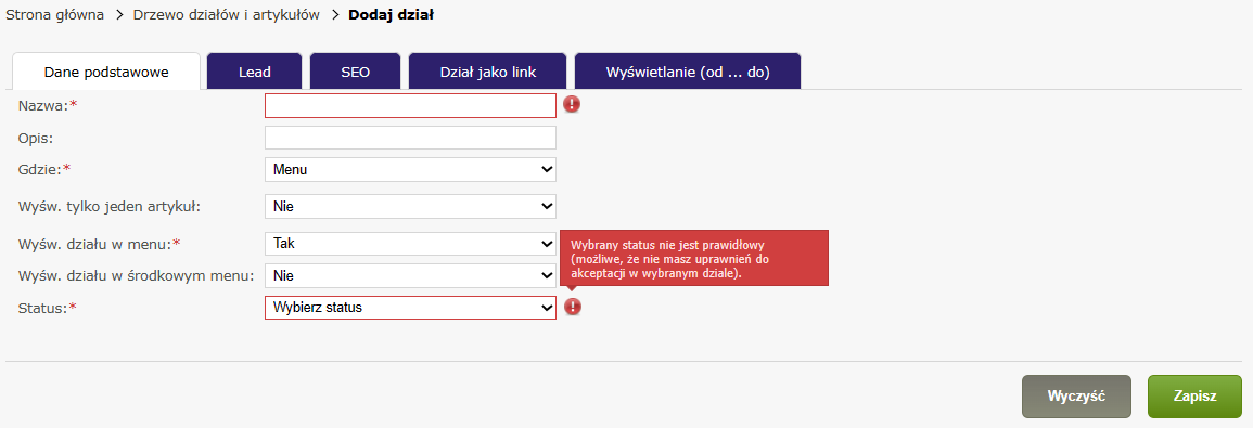 W przypadku niewłaściwego wypełnienia lub braku wypełnienia pól wymaganych w formularzu dodawania działu, pojawi się komunikat o błędnym wypełnieniu formularza. Po wybraniu przycisku Popraw dane przy błędnie wprowadzonych polach pojawi się chmurka z podpowiedzią jak właściwie treść powinna być wprowadzona.
