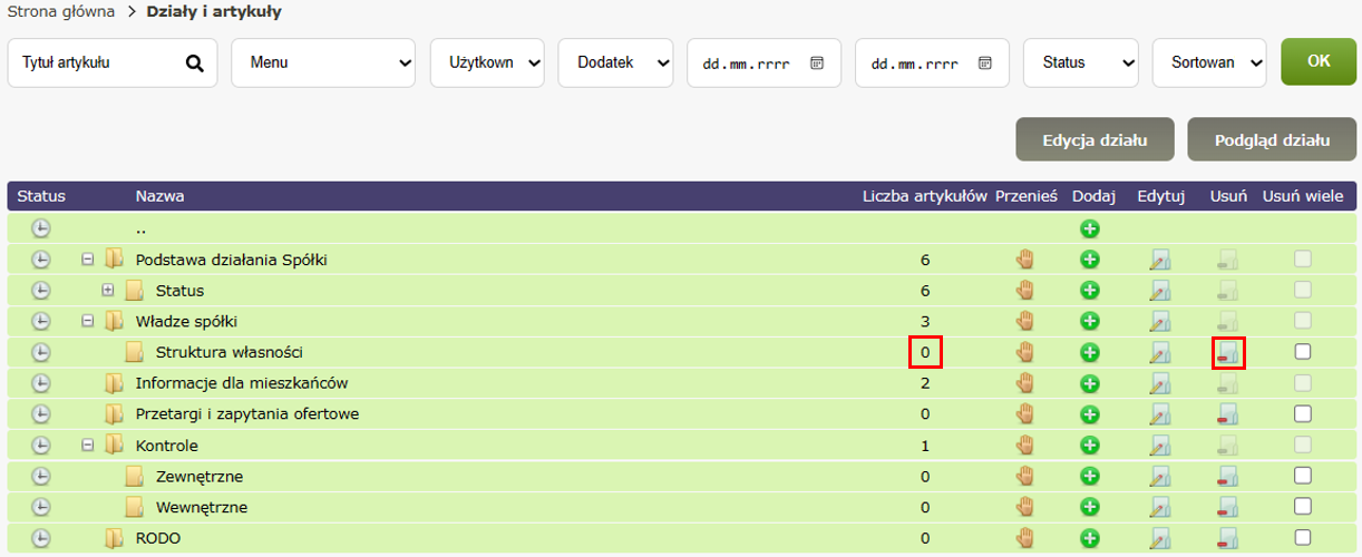 W systemie jest możliwość usuwania działów, które nie zawierają artykułów lub poddziałów. W celu usunięcia wybranego działu należy: