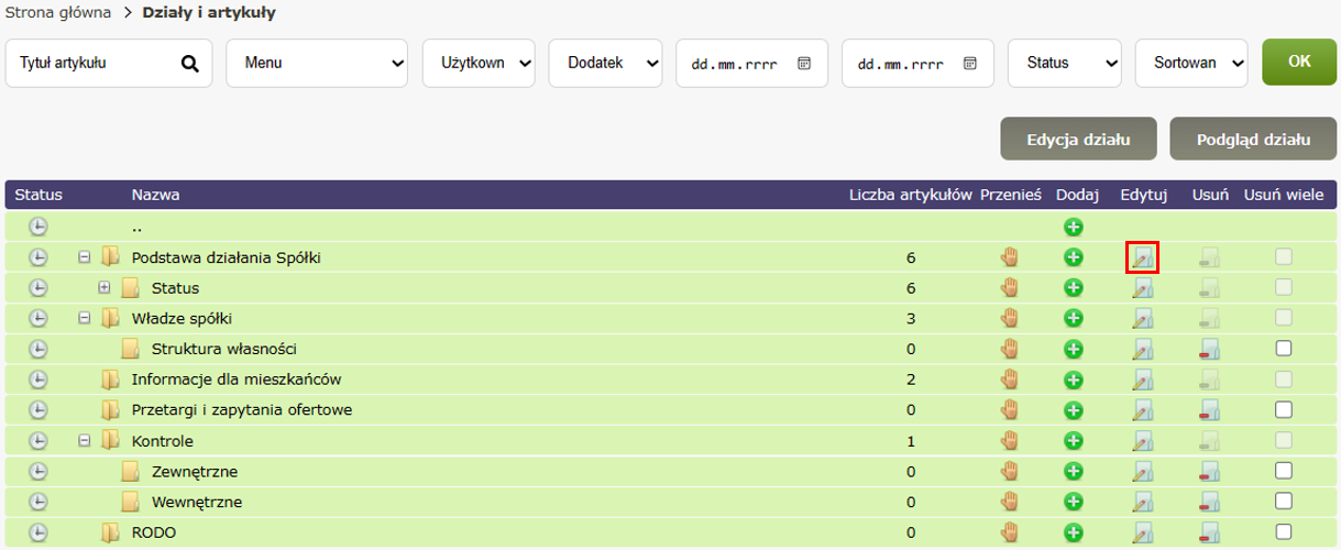 Aby wyświetlić drzewo działów dodanych do serwisu należy kliknąć Działy i artykuły. na wyświetlonym ekranie widzimy: