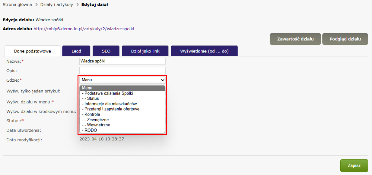 - Należy wypełnić pola formularza dodawania działu (opis pól znajduje się w tabeli poniżej) a następnie kliknąć przycisk Zapisz.